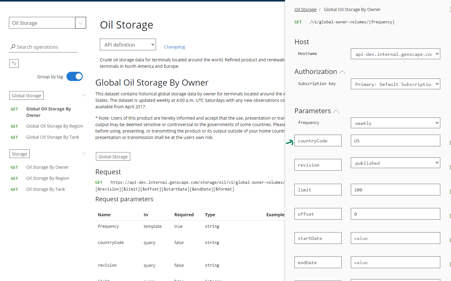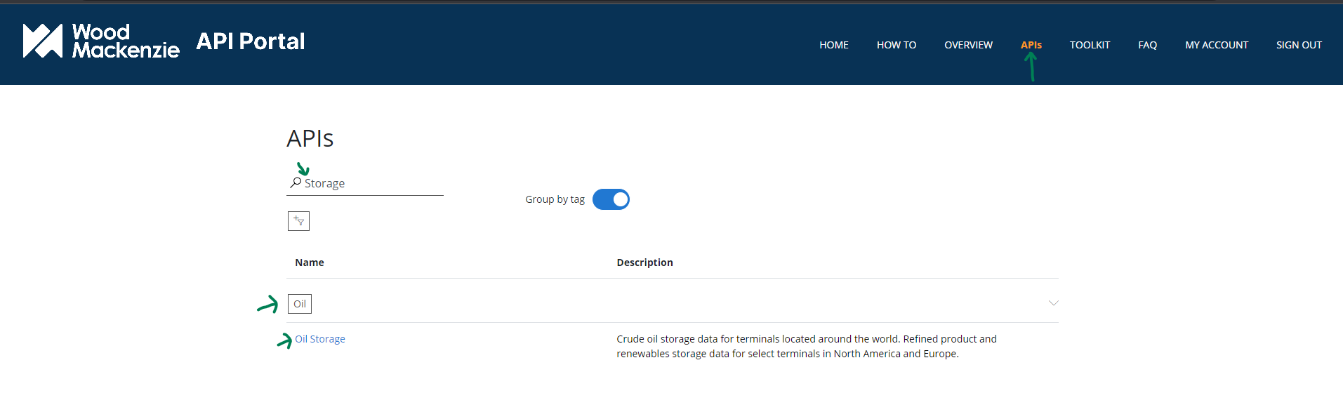 Click "APIs" in the menu above to see our list of APIs. Then select one to see its details. In this example, we'll choose "Oil Storage." Search for keyword "Storage" (or) navigate via Oil --> Oil Storage tags.