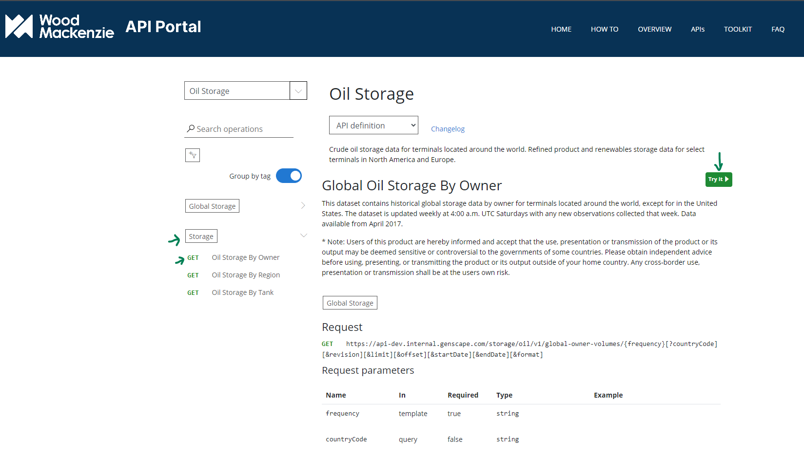 For example: click on Storage --> Global Oil Storage By Owner then click the "Try It" button and view the data returned.