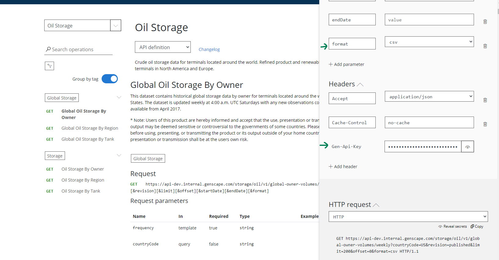 Also notice that your Wood Mackenzie API key is filled in as the Gen-Api-Key header. You can view and copy it here, along with the Request URL, for use in other applications. More details are available in our other "How To" documentation.